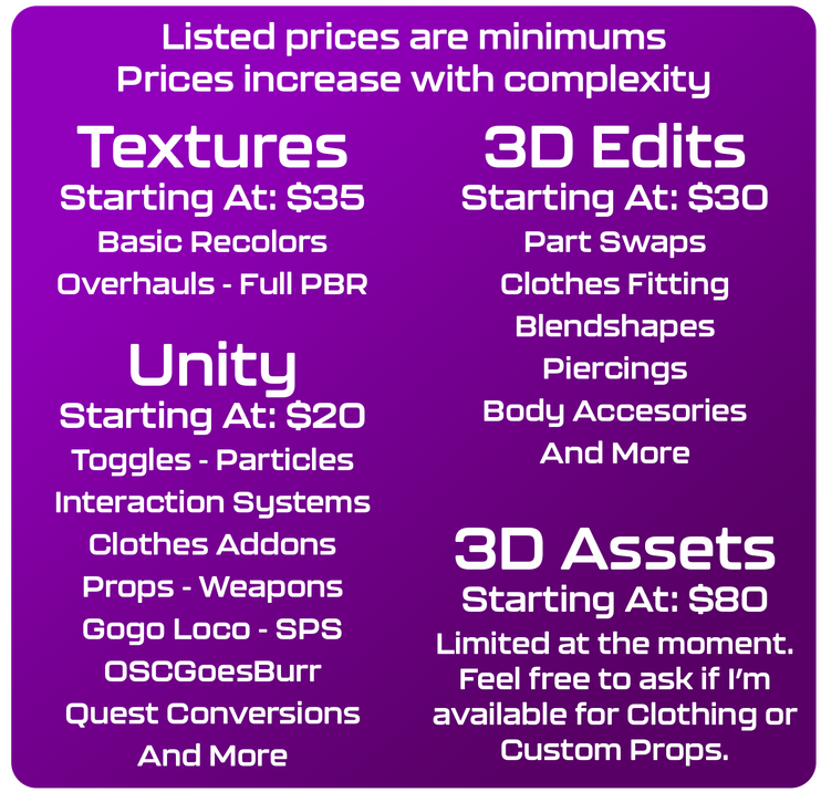 Process- Prices listed are a MINIMUM. The final price will be decided when I provide a quote. Quoted prices are final and nonnegotiable.- If no reference sheet is provided or you intend to work off a concept, it will cost an additional fee.- Please be patient with commissions. An intended finish window will be set when providing a quote. However, delays are possible and delivery windows are not a guarantee. Allow at least 2 months for completion.- Updates will be provided throughout the commission timeline. Feel free to ask about an update every once in a while.- When the commission is completed, a final check will be done, and the second half of the payment will be given if applicable. Then the assets will be sent. Minor tweaks can be requested at this point. Major changes will cost extra.- If there are any major issues (texture errors, weight painting problems, broken animations, etc.) noticed after the commission is done, I will fix it free of charge as soon as I am able to.- Be kind and considerate, please. Rude, disrespectful, aggressive, or harassing conduct towards me while I am completing the commission will result in me canceling it. No refund will be given in this event.Payment- Payment will be conducted through a PayPal invoice sent to your email. Payment quotes are given in USD.- For commissions under $80, the whole price must be paid upfront.- For commissions greater than or equal to $80, 50% will be paid when work is started and the other 50% when it is ready to be delivered.- NO assets will be sent until payment is completed.- Since this is a major source of income, I am not able to provide a refund if requested.- In the highly unlikely event I am completely unable to finish a commission, I will provide a partial refund. (I keep a minimum 25% of the total price.)Terms of Use- My commissions are intended for personal and commercial use.- You may NOT use assets made by me for any hateful contexts.- You may NOT claim to have created any assets made by me.- You may NOT resell assets made by me, unless specifically agreed upon. This includes reselling on its own, or as part of another package.- I reserve the right to refuse a commission for any reason I see. Including it being beyond my current skill, too large in scope, or it being a subject I am uncomfortable doing.- I reserve the right to post a commission on my socials and portfolio, unless requested otherwise.- When posting content of commissioned avatars on social media, please credit me at @evesix2 on Twitter and Bluesky.- Any paid assets require you to show proof of purchase before I use it.- If an asset used is made by another creator, you must follow the TOS and property rights of said creator. Especially when using the commission commercially.By commissioning me, you confirm that you have read and AGREE to all terms and conditions above.