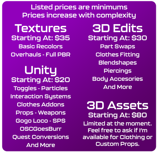 All prices listed are a minimum price. Complex work will cost more.To request a Commission, please fill out the form below. I will reach out to you on Discord. Do not spam me on my socials about responding to form requests.I will not respond to form entries if my slots are full.